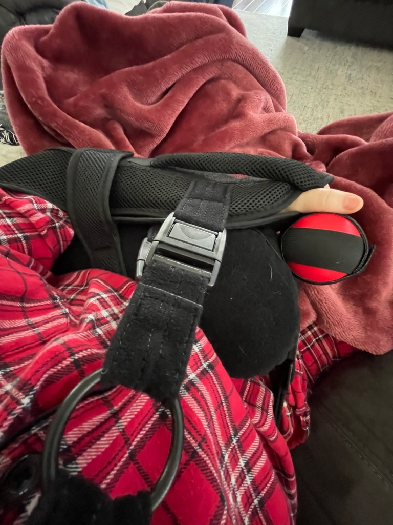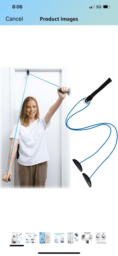 The progress has been s-l-o-w. Like so much slower than rehabbing my broken ankle back in 2017. I’ve purchased some of the contraptions I use in PT for home use. I currently have a pulley, and I put up my BeachBody track to help me with my triceps and biceps work. The Mr. fashioned a cane-like thing from PVC pipes after seeing the one I use at PT. This has been a handy tool that I’ve used to work on my external rotation. I’m also trying to regain the ability to put my arm behind my back. This tool is helping with this.