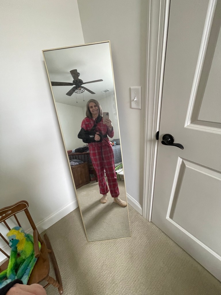 I still have things I can’t do, like washing my back, reaching behind me to hook my bra, taking off a jacket or sweater, and opening or closing my blinds. I’m getting there though!