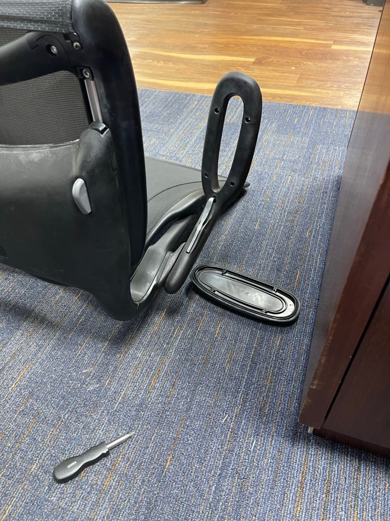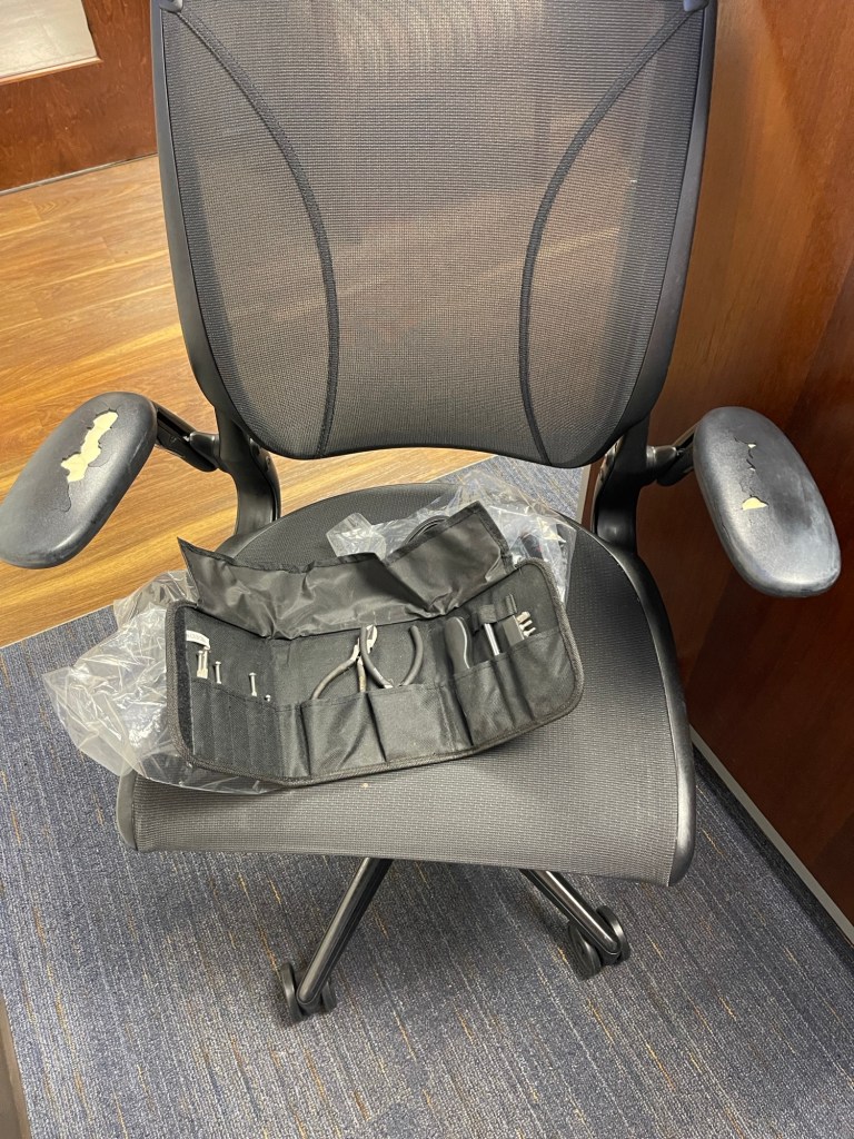 Our office chairs were very expensive once upon a time. The chair you see pictured is used daily by our students; it’s the third or fourth chair that has needed its arm chair pads replaced.