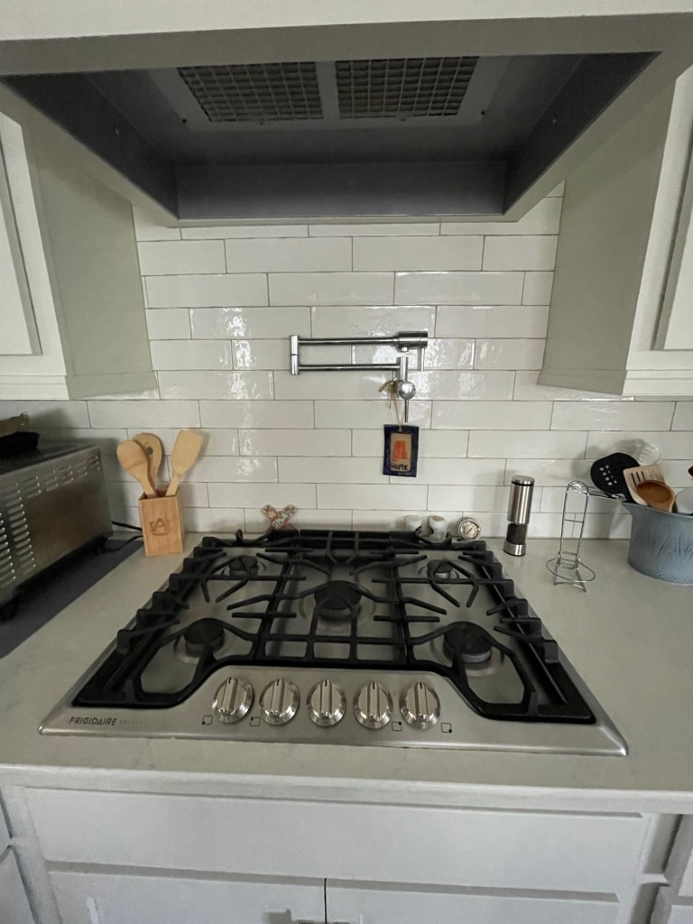 The stove is my favorite. It runs on gas, and there’s a pot filler on the wall above it.