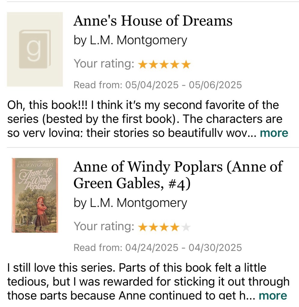 The first book let me in stitches with Anne’s various antics, and a deep love for Matthew and Marilla Jones as cultivated in my heart as they opened up their hearts and home for this talkative little chatterbox.