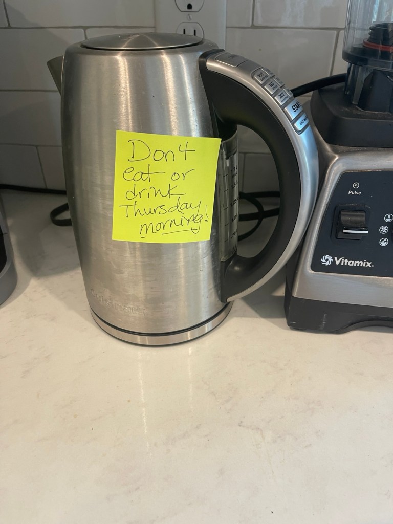I put reminders in a couple of places to make sure I don’t eat or drink anything. I’m function on autopilot each weekday morning, so I didn’t want to mess anything up with this little hiccup in my routine.