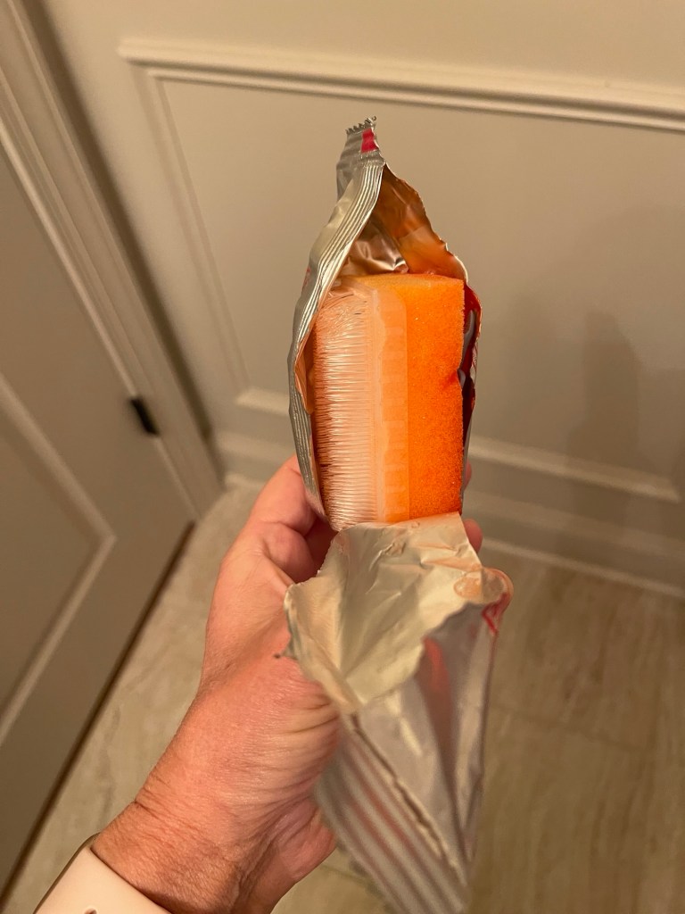 The scrub is interesting. You shower as normal and then scrub your body with the cleanser-laden sponge. Then, you wait, without the water running, for five minutes, to let the cleanser do its thing before finally rinsing off.