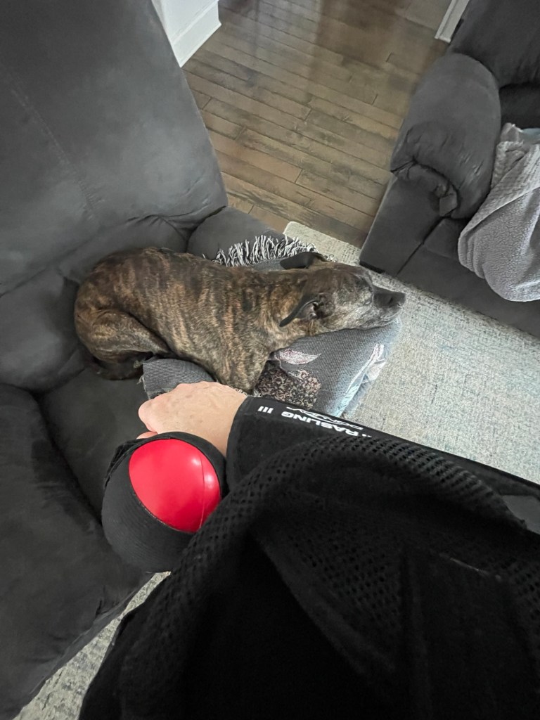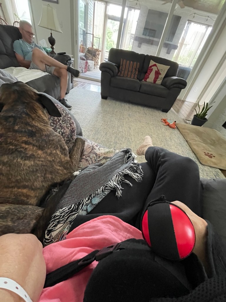 Gambit was very happy to see us, and I think he’s happier because the surgery was on the right arm, which means he can still sit with me in my recliner because he sits on my left side.