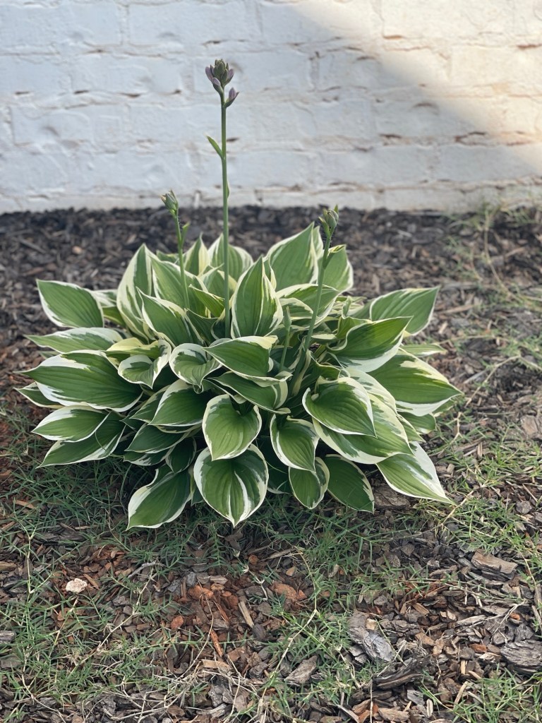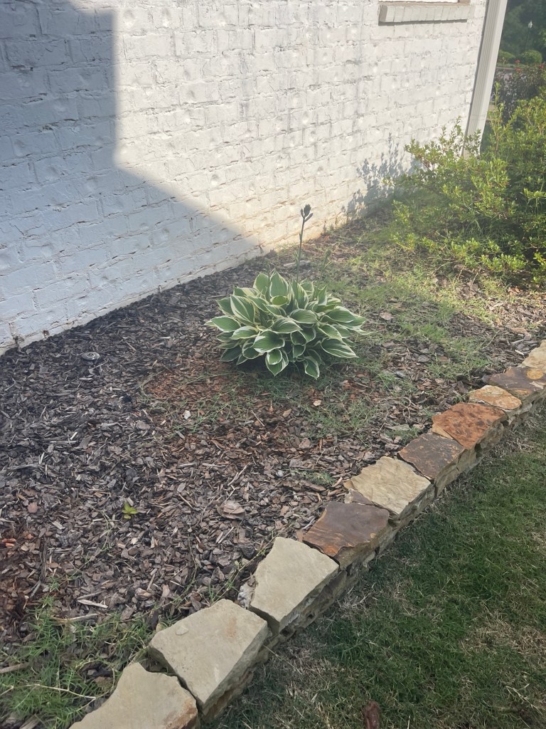 This entire flower bed has clay beneath the mulch. Planting the hostas was a BEAST of a job. The Mr. dug every single hole, and I supplemented with extra soil and fertilizer. We didn’t think they’d last long. The last plant in the row looked like it was gone forever.