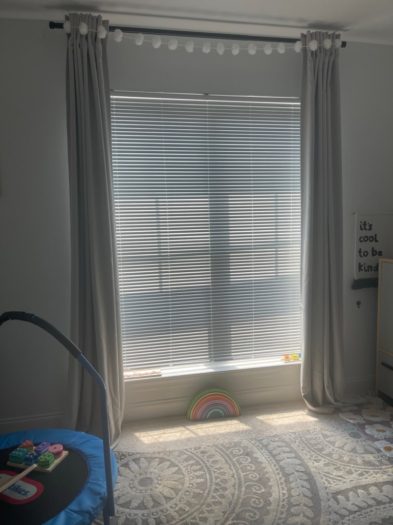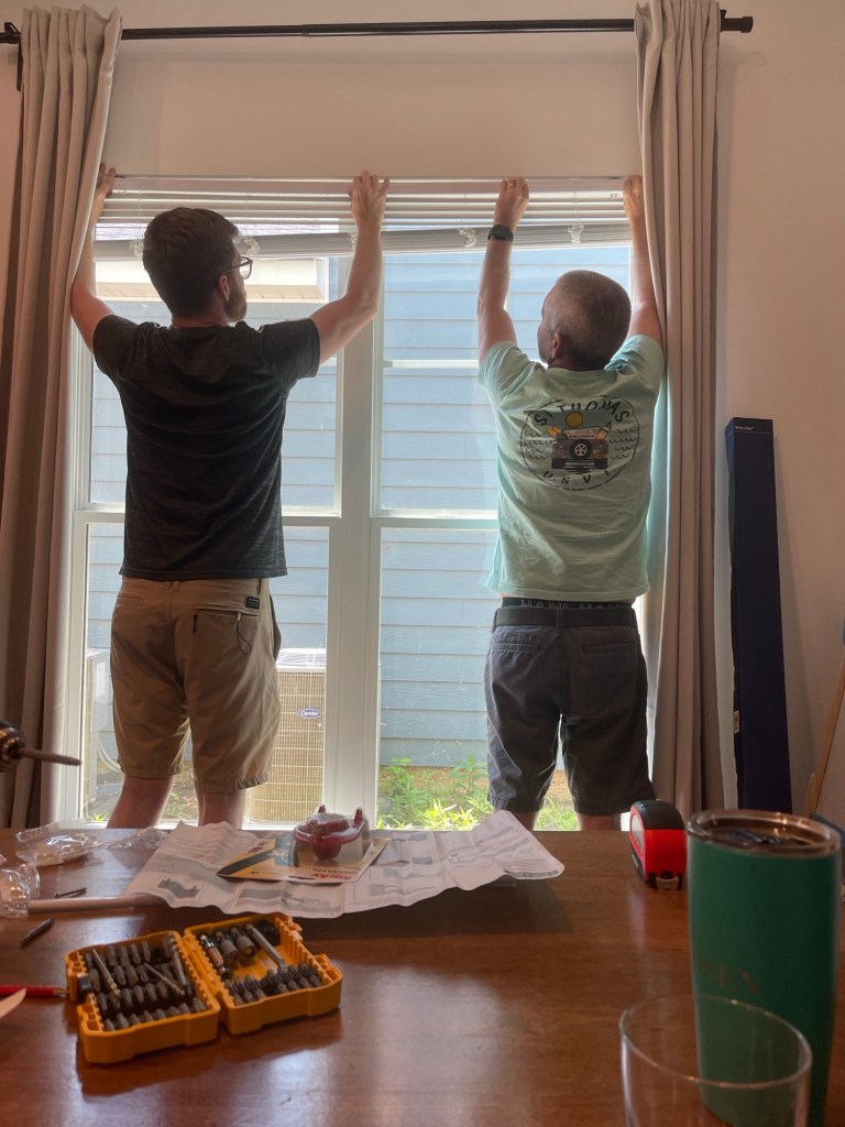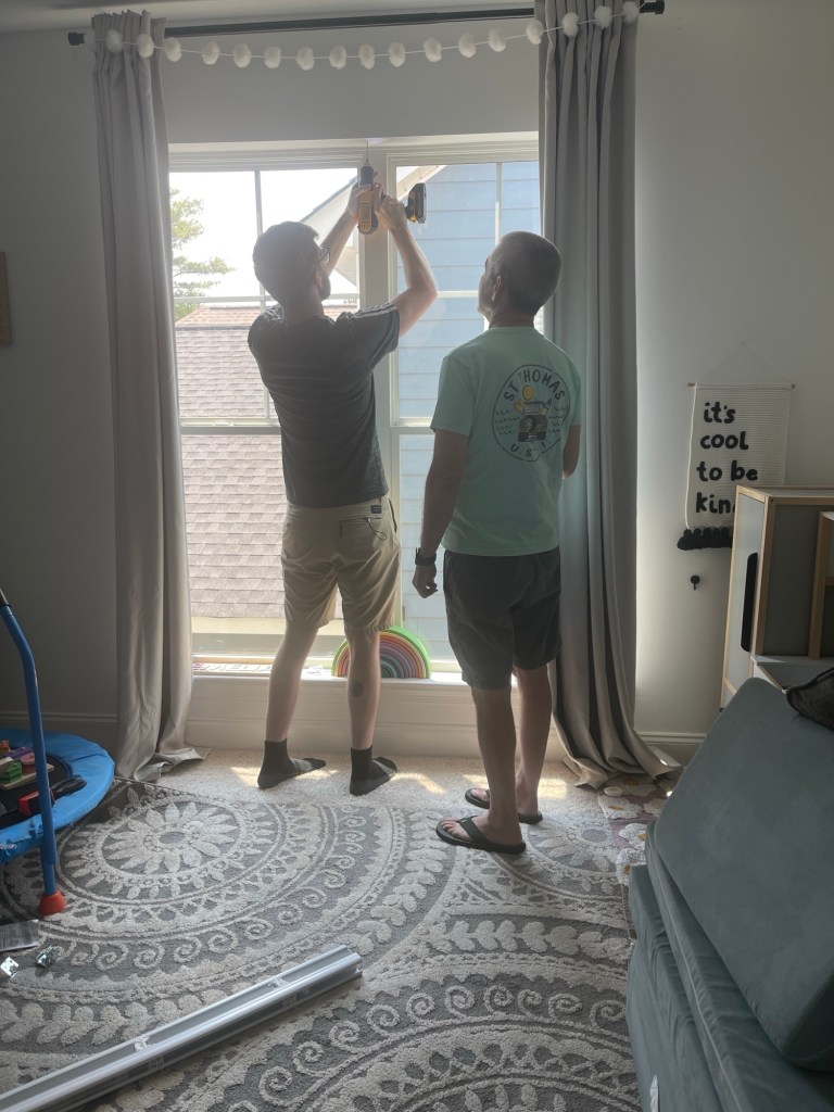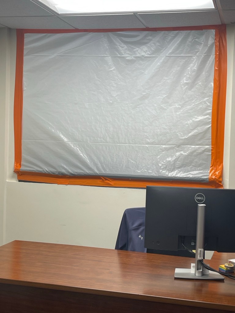 Old paint is getting scraped off of the outside windowsills. To prevent a mess inside, the workers taped plastic around the edges.