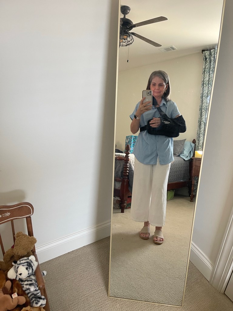 I can’t pull things over my head yet, but I will be able to in a few months. This will look so good with blue jeans or shorts.