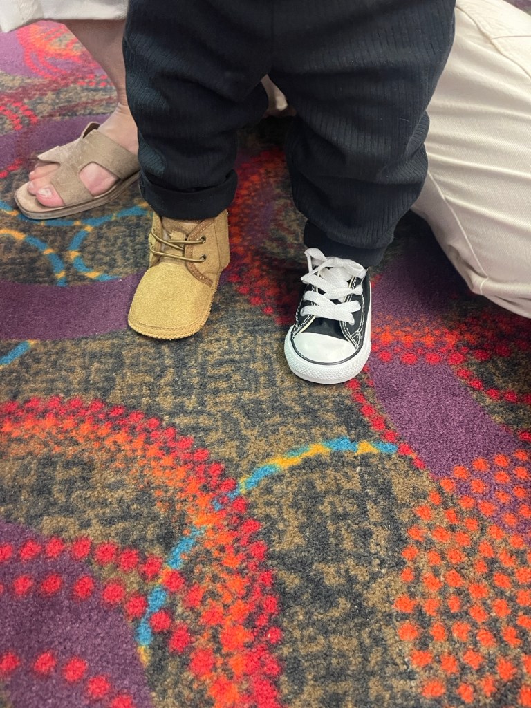 After a quick lunch at home, two of the kids went down for a nap, and some of the grownups dispersed to go shopping. Chicky and I took Little Miss to get shoes. E girl recently started walking and doesn’t really need shoes unless the grass, which she loves to play on, is wet.