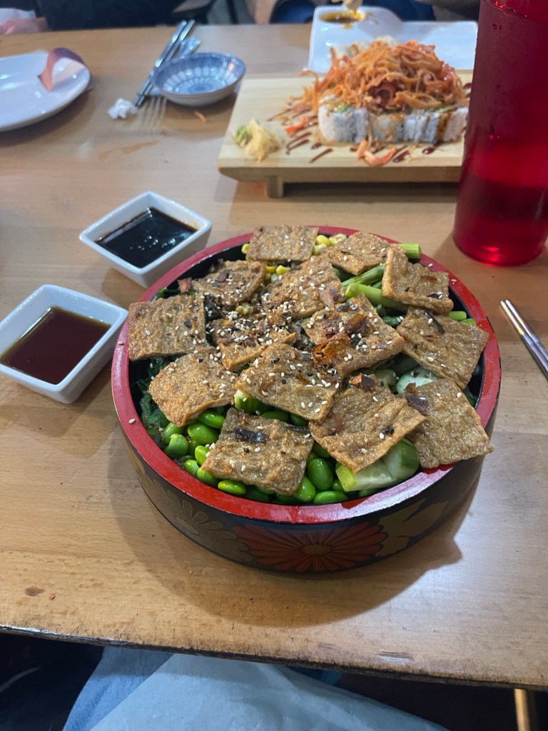 My poke bowl was the best I’ve ever had. That’s tofu, prepared in thin squares, on the top.