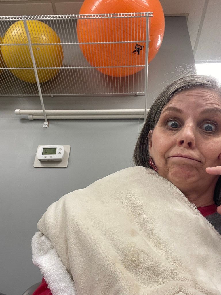 My therapist had several new exercises for me to try out. My shoulders were on fire when I finished: the TENS stimulation was a blessing before I headed home.