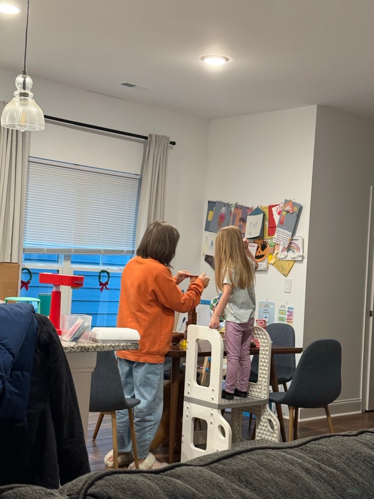 They had a busy day ahead of them, so we got our visit in early. We gave the grands an art easel, smocks, clothes for the littlest one, and a scooter for the oldest.