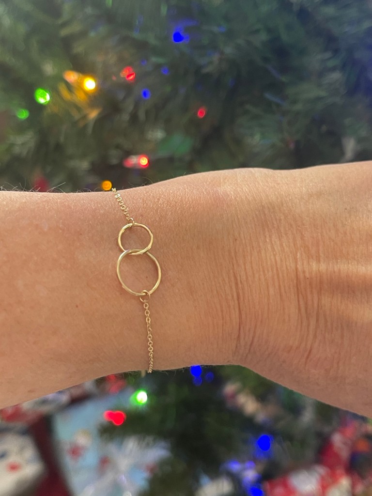The bracelet was on my Christmas list. I’ve got a necklace that is very similar, and I bought a ring with the circle on our cruise last February. It’s a theme, y’all.