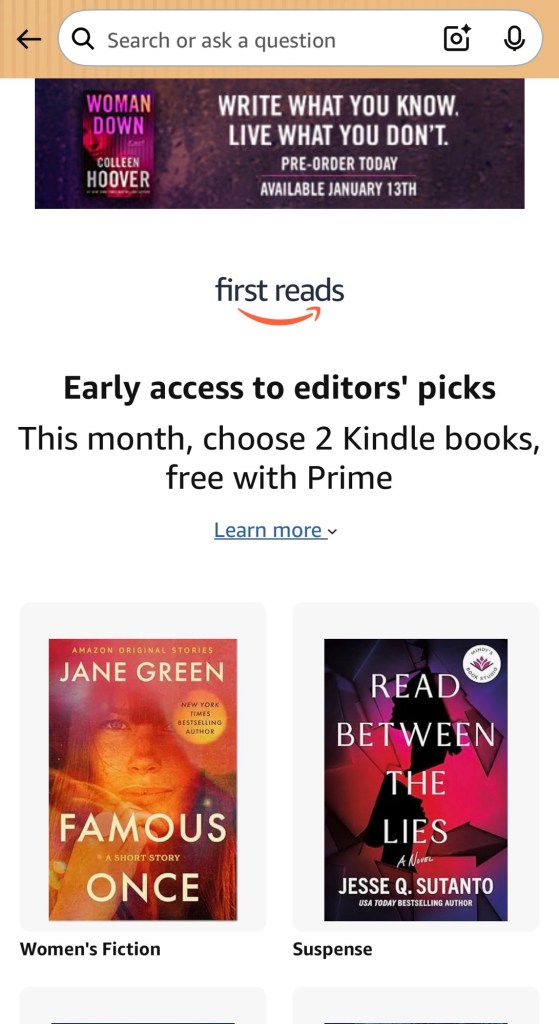 I downloaded two free Prime First Reads books first thing this morning. If you’ve got a Prime account, you can find them by typing Prime First Reads in the search bar. Amazon is offering two this month!